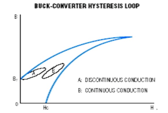 磁芯損耗主要是由于磁滯現(xiàn)象以及磁芯內(nèi)部傳導(dǎo)率或其他非線性參數(shù)的互感產(chǎn)生。在Buck拓?fù)浣Y(jié)構(gòu)中,第一象限的B-H磁滯回線對磁芯損耗影響最大。在第一象限這個局部圖中,磁滯回線顯示了電感從初始電感量過渡到峰值電感量再回到初始電感量的過程。如果開關(guān)電源穩(wěn)定工作在不連續(xù)狀態(tài),磁滯回線會從剩余電感量(Br)過渡到峰值電感量(參考圖1)。如果開關(guān)電源工作在連續(xù)狀態(tài),那么磁滯回線將會從直流偏置點上升到曲線峰值,再回到直流偏置點。通過實驗可以確定磁滯回線的精確曲線形狀(基本上是橢圓曲線)。