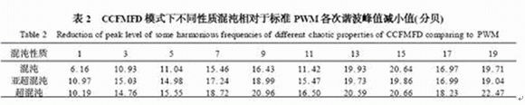 從表中給出的以標準周期PWM前19次諧波為參照的數(shù)據(jù)可以看出,分別在混沌、亞超混沌及超混沌信號調(diào)制下,各次諧波對應處的頻譜數(shù)值都得到了明顯的降低。在混沌信號調(diào)制下,諧波對應處的頻譜數(shù)值平均降低14.87分貝(dB);在亞超混沌信號調(diào)制下,諧波對應處的頻譜數(shù)值平均降低16.84分貝(dB);在超混沌信號調(diào)制下,諧波對應處的頻譜數(shù)值平均降低17.86分貝(dB)。若以歐盟(89/336/EEC指令)電磁兼容性導則中限制設備輸入電流諧波分量最大值幅度這一原則,來討論不同性質(zhì)混沌信號降低電磁干擾水平的效果,結論非常明顯,即以超混沌信號作為開關調(diào)制信號源,比混沌能更好地降低電磁干擾水平。