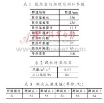 軟件計算結(jié)果:表1為散熱器的物理結(jié)構(gòu)和參數(shù);表2為風(fēng)機的風(fēng)量和風(fēng)壓計算結(jié)果;表3為散熱器上選擇的五個測試點的溫度值。