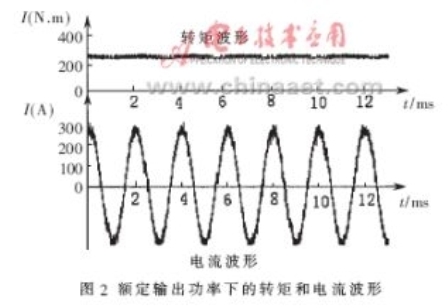 電機額定功率為57kW,額定轉(zhuǎn)矩為270N•m,額定轉(zhuǎn)速為2000r/min,額定端電壓為230V。變頻器系統(tǒng)參數(shù)根據(jù)使用的電機進行匹配。在額定功率下運行時的轉(zhuǎn)矩和電流波形如圖2所示。