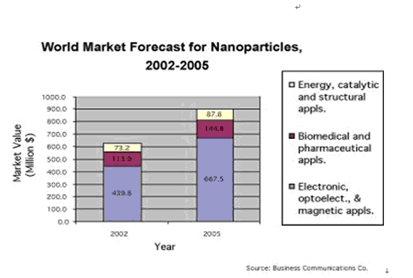 納米科技是21世紀(jì)科技發(fā)展的重要技術(shù)領(lǐng)域,藉由納米科技將創(chuàng)造另一波技術(shù)創(chuàng)新及產(chǎn)業(yè)革命。近年來歐美日各國均投入大量人力與經(jīng)費(fèi),進(jìn)行納米材料與應(yīng)用技術(shù)的開發(fā)。納米材料應(yīng)用的范圍甚廣,包含化工、民生、消費(fèi)性電子、光學(xué)、生物、制藥、能源等產(chǎn)業(yè)的應(yīng)用。根據(jù)美國市調(diào)機(jī)構(gòu)Business Communication之調(diào)查分析結(jié)果,納米材料在整體產(chǎn)業(yè)的應(yīng)用上,于2005年市場需求值可達(dá)9億美元,如(圖一)。諾貝爾獎得主Dr. Smalley表示,未來五十年人類面臨十大問題中,以能源居首,能源需求量成長了3~4倍,而納米技術(shù)將可帶動納米能源的革命性發(fā)展與突破,包括納米鋰電池、太陽能電池、燃料電池、儲氫系統(tǒng)、光觸媒、光電池等等應(yīng)用。