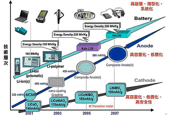 鋰二次電池雖然已廣泛使用于3C產(chǎn)品上,然而隨著筆記型電腦使用1GHz CPU而增加耗電量,以及LCD螢?zāi)怀叽缂哟?、解析度提高、使用高容量硬碟及DVD-ROM等趨勢,未來筆記型電腦整體功率消耗明顯提高,因此對鋰電池主要的技術(shù)提升需求,包括提升電池能量密度、降低重量與智慧型電源管理。未來行動電話從2G提升至3G時,不論是GSM、WCDMA等系統(tǒng),所需要的電池能量密度都需要明顯的增加。目前薄型鋰電池系統(tǒng)的重量能量密度雖有顯著的提升,但主要是罐體外殼的輕量化,在電極材料的性能提升上,進(jìn)展較少。針對3G所強(qiáng)調(diào)的高體積能量密度>420 Wh/L要求,目前薄型鋰電池的體積能量密度(340~360 Wh/L)仍無法符合其規(guī)格目標(biāo)。未來各種多功能的手錶(Multifunctional Watch),將具有Phone、DSC、MP3等功能,此時對能量密度高且薄型化鋰電池的需求更加迫切,另一方面3G行動電話與結(jié)合電腦、PDA、行動電話等功能的行動資訊與通訊終端產(chǎn)品(Mobile IA),將大量地被使用,對具有高能量密度的鋰電池同樣迫切需求,如(圖二)。因此開發(fā)高容量及高功率的納米級鋰電池材料,并應(yīng)用于新世代的納米鋰電池上,是全世界鋰電池業(yè)者目前最重要需突破的目標(biāo)。