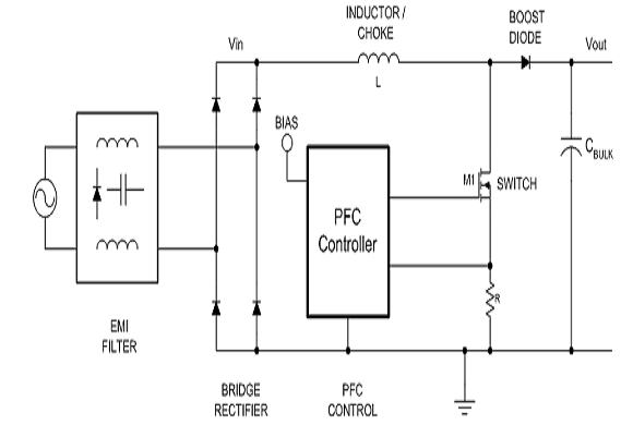 [圖中文字:電感/扼流線圈、升壓二極管、PFC控制器、功率開關(guān)、橋式整流器、PFC控制、EMI濾波器]