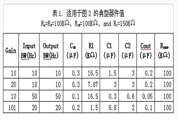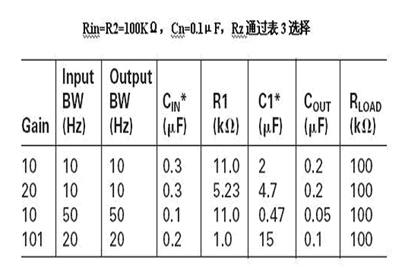 設(shè)計單電源運(yùn)算放大器電路,需要考慮輸入偏置電流誤差、電源抑制、增益、以及輸入與輸出線路帶寬等等。然而普通的應(yīng)用設(shè)計是可以通過查表來獲得,見表1。在單電源電壓為15V或12V時偏置分壓的兩個電阻通常選用100kΩ,這樣可以在電源消耗與輸入偏置電流誤差之間合理的折中。5V單電源偏置分壓電阻減小到一個比較低的值,例如42kΩ。還有些在3.3V應(yīng)用中偏置分壓電阻選在27kΩ左右。
