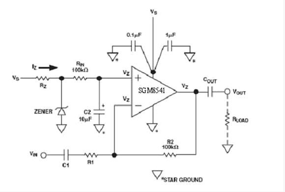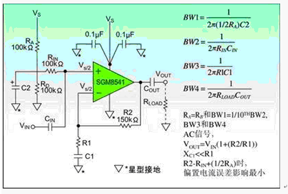 首先,電路的電源抑制幾乎沒有,電源電壓的任何變化都將直接通過兩個分壓電阻改變偏置電壓Vs/2,但電源抑制的能力是電路非常重要的特性。例如此電路的電源電壓1伏的變化,能引起偏置電路電壓的輸出Vs/2變化0.5伏。該電路的電源抑制僅僅只有6dB,通過選用SGM8541運(yùn)算放大器可以增強(qiáng)電源抑制能力。