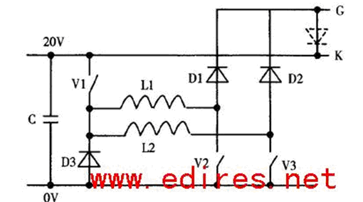 硬驅(qū)動(dòng)關(guān)斷如圖4所示電路,當(dāng)將V6 開通時(shí),電容C 對(duì)門極反向放電,將IGCT關(guān)斷。由于電路的極低電感(5 到15nH 取決于IGCT 的型號(hào))和大電容器組,IGCT對(duì)門2陰極端的電磁噪音不敏感。與IGCT相比較,傳統(tǒng)的GTO驅(qū)動(dòng)裝置大約有200 nH的電感和更小的電容器組。