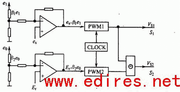 es = i1Rs 壓降,與β1e1 經(jīng)加減運算電路后得es-β1e1 并送入PWM 1控制器。 其輸出Vs1作為開關管S1 的驅(qū)動信號,S1的導通時間為Ton1。它采用的是前饋控制,目的是把e1 和i1的擾動所引起的系統(tǒng)瞬態(tài)誤差減到最小,以改善系統(tǒng)的瞬態(tài)響應。