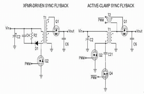 圖1-兩種電源均使用了次級同步整流,但是左邊的電源使用電源變壓器來驅動同步 FET,而右邊的電源則使用一個柵極驅動變壓器并且還采用了一個有源鉗位。