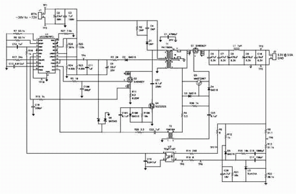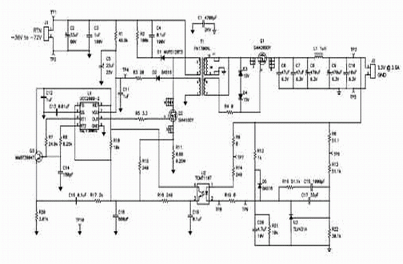 圖 3 顯示了傳統(tǒng)同步反向電源設計的完整原理圖。該設計使用了一個低成本、簡化的電流模式 PWM 控制器(即 UCC2809),對電源進行控制。除了主緩沖器以外,該電路還需要D3 和 D4 的齊納鉗位電路,以防止來自漏極電感峰值的 Q1 超高柵-源電壓。