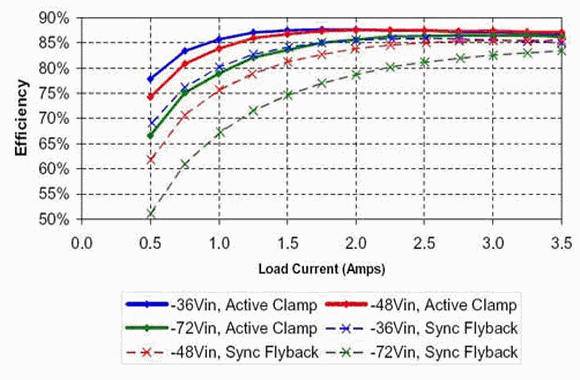 有源鉗位所提供的所有這些小小的改進都會對效率產生很大的影響。圖 7 顯示了在最小、額定及最大輸入電壓值時測量得出的兩種設計的效率。在所有線電壓情況下,有源鉗位設計將最大負載效率提高了 2% 左右。在輕負載的情況下,這種區(qū)別更位明顯。額定線電壓及輕負載情況下,效率提升超過了 12%,這對于長時間處于空閑模式的系統(tǒng)來說是很重要的。大部分效率提升都來自漏極電感能量的恢復,漏極電感能量耗散通常發(fā)生在緩沖器中,并減少了同步 FET Q1 直通帶來的損耗。