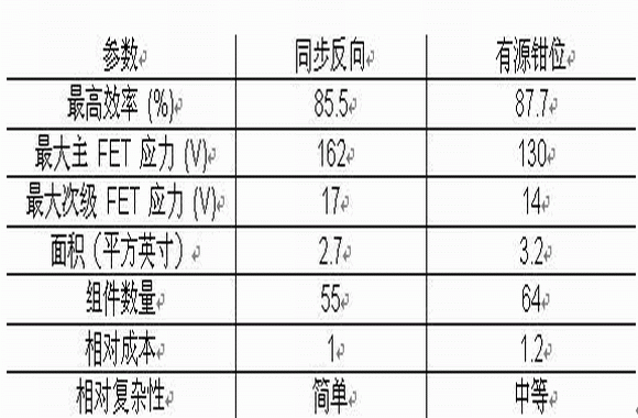 表 2 列出了對兩種同步反向電源主要部分進行比較的總結。該表說明了有源鉗位反向電源相對于變壓器驅動同步反向電源在性能上的優(yōu)勢。尤其是在輕負載情況下,有源鉗位反向電源具有更低的 FET 電壓應力及更高的效率。有源鉗位控制器 (UCC2897) 的可編程停滯時間特性(該特性可防止主、次級 FET 的疊加傳導 (overlapping conduction))有助于最小化 Q1 二次側直通損耗。這些損耗一般表現(xiàn)為可在主電流感應電阻器上觀測到的一個大電流峰值,且經常會導致輕負載抖動的問題。有源鉗位反向電源較低的高頻振鈴會產生更少的 EMI 及一個全局范圍內更低噪聲的電源。由于漏極電感對有源鉗位電路性能的影響較小,因此,盡管同步反向電源并不是一無是處,但比起帶有同步反向的情況,高頻操作更有可能實現(xiàn)。在這兩個示例電路中,與有源鉗位反向電源相比,傳統(tǒng)的同步反向電源可將 PWB 面積、組件數(shù)量和成本上降低大約 15%~20%。這是一款容易設計和(可論證性地)理解的更簡單的電路,雖然如此,但還是要考慮到其在性能上的一些不足。那么,您應該在什么時候選擇一個有源鉗位反向電源呢?如果輸出功率較低,同時設計要求一直進行連續(xù)模式運行,那么有源鉗位反向電源可以實現(xiàn)高效率、低 EMI 運行。在輕負載效率較為關鍵的應用中,它具有一個更為明顯的優(yōu)勢。
