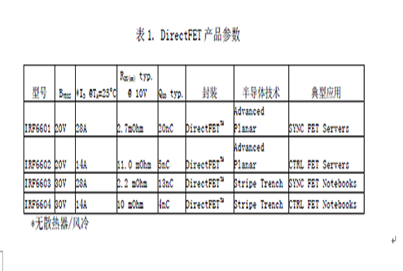 最先使用DirectFET封裝的器件是20 V和30V的同步降壓變換器芯片組,用做調(diào)整管和同步管(表1)。