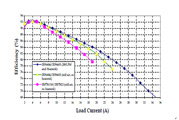 在一個(gè)12V輸入,1.3V輸出,工作頻率300kHZ的同步降壓變換器中,我們將IRF6603/IRF6604和IRF7822/IRF7811W這兩對(duì)管子做以比較,它們使用的硅片技術(shù)是相同的。負(fù)載電流增加時(shí),此變換器電路板的溫度不得超過105°C。當(dāng)電流達(dá)到18A時(shí),這是SO8封裝在無(wú)冷卻氣流的條件下能夠承受的大電流,IRF6603的結(jié)溫要低50°C。比較DirectFET和SO-8在靜止空氣無(wú)散熱器條件下的效率曲線,在18A時(shí)前者的效率要高出3%。