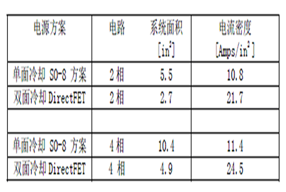 為了計(jì)算方便,假設(shè)單面冷卻的器件被限制在0.5 in2 的PCB板內(nèi),我們知道設(shè)計(jì)者往往用到1in2 以盡可能增加SO8的輸出電流。DirectFET器件布置在最小的管腳尺寸內(nèi)。下表給出了論證結(jié)果,表明在大電流DC-DC變換器中,雙面散熱的DirectFET的電流密度能比單面散熱的SO8的增加一倍。