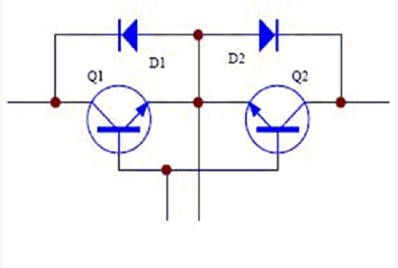 旁路開關(guān)常使用繼電器和可控硅。繼電器在中小功率的UPS 中廣泛應(yīng)用。優(yōu)點是控制簡單,成本低,缺點是繼電器有轉(zhuǎn)換時間,還有就是機電器件的壽命問題??煽毓璩R娪谥写蠊β蔝PS 中。優(yōu)點是控制電流大,沒有切換時間。但缺點就是控制復(fù)雜,且由于可控硅的觸發(fā)工作特性,在觸發(fā)導(dǎo)通后要在反向偏置后才能關(guān)斷,這樣就會產(chǎn)生一個最大10ms的環(huán)流電流,如圖2。如果采用IGBT,如圖3,則可以避免這個問題,使用IGBT 有控制簡單的優(yōu)點,但成本較高。其工作原理為:當(dāng)輸入為正半周時,電流流經(jīng)Q1、D2,負半周時電流流經(jīng)D1、Q2。