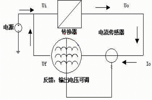 在能量反饋部分就要能實現(xiàn)上述要求,保證穩(wěn)定的電能轉(zhuǎn)換器的輸出電流,采用電流傳感器檢測電能轉(zhuǎn)換器的輸出電流,同時反饋部分采用反饋電壓與輸出控制電流之間成反比系數(shù)關(guān)系即Uf∝K/Io,為便于分析,設(shè)電源電壓Ui為穩(wěn)定值。當輸出電流較小時,通過調(diào)節(jié)反饋電壓,使其變大,則反饋電壓與輸入的電壓差△U=Uf-Ui變大, 相應(yīng)的由反饋電壓流向輸入電壓的電流加大,造成相應(yīng)的反饋功率加大;當輸出電流較大時,通過調(diào)節(jié)反饋電壓,使Uf變小,則反饋電壓與輸入的電壓差△U變小,相應(yīng)的由反饋電壓流向輸入電壓的電流減小,造成循環(huán)的功率減??;整個過程維持負反饋控制,最終達到動態(tài)平衡,維持設(shè)定的額定功率。