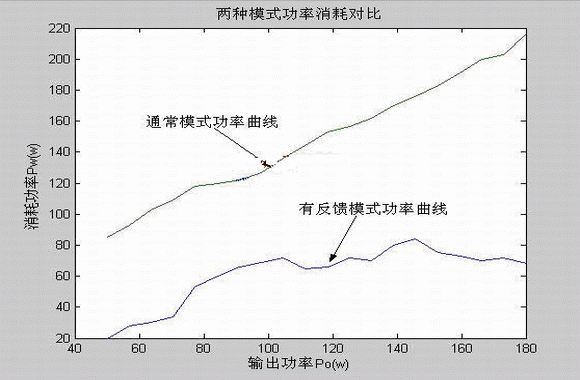 結(jié)果分析:在通常工作模式情況下,曲線的波動是由于電能轉(zhuǎn)換器的轉(zhuǎn)換效率影響造成的,由前面原理分析可知消耗功率為Pi=Po+Pw, 如果轉(zhuǎn)換效率為 ,則Pi=Po/η,轉(zhuǎn)換效率η通常隨著輸出功率的變化有一定的波動,所以曲線的波動符合理論分析;在有反饋的工作模式情況下,由前面原理分析部分得系統(tǒng)的消耗功率為Pi=Pw+Pwf,分別設(shè)轉(zhuǎn)換器1的轉(zhuǎn)換效率為η1,反饋部分的轉(zhuǎn)換效率為η2,則系統(tǒng)的消耗功率為: