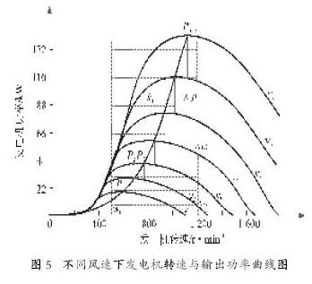 風(fēng)力機(jī)通過葉輪來捕獲流動的風(fēng)能,風(fēng)的能量轉(zhuǎn)化為葉輪旋轉(zhuǎn)的動能,齒輪箱再把這種機(jī)械能傳輸?shù)桨l(fā)電機(jī),由發(fā)電機(jī)通過內(nèi)部的電磁關(guān)系將機(jī)械能變?yōu)殡娔茌敵?。圖5為在不同風(fēng)速下,葉輪轉(zhuǎn)速與風(fēng)力機(jī)輸出功率的關(guān)系圖。由圖可知,對應(yīng)于每個(gè)風(fēng)速的曲線,都有一個(gè)最大輸出功率點(diǎn),風(fēng)速越高,輸出功率越高,相應(yīng)的葉輪轉(zhuǎn)速也越高。因此,如果能隨風(fēng)速變化改變?nèi)~輪轉(zhuǎn)速,使得風(fēng)力機(jī)在所有風(fēng)速下都工作于最大功率輸出點(diǎn),則發(fā)出電能最多,否則發(fā)電效能將降低。