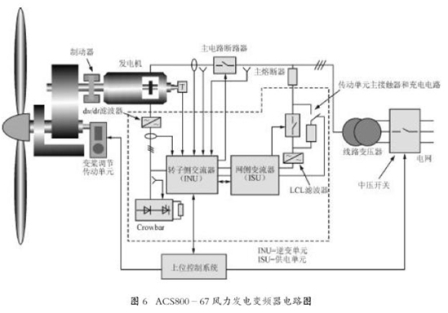ACS800-67 風(fēng)力發(fā)電變頻器主要和帶有轉(zhuǎn)子繞組和滑環(huán)的感應(yīng)式發(fā)電機(jī)一起使用,連接于雙饋發(fā)電機(jī)轉(zhuǎn)子和電網(wǎng)之間,電路圖如圖6所示。該變頻器既可以安裝在塔基處也可以安裝于發(fā)電機(jī)艙內(nèi)。
