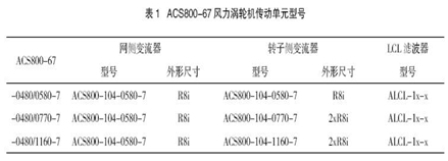 如前所述,雙饋風(fēng)力發(fā)電系統(tǒng)的變頻器由于接在發(fā)電機(jī)的轉(zhuǎn)子側(cè),所以變頻器容量可小于發(fā)電機(jī)的容量,僅為發(fā)電機(jī)的轉(zhuǎn)差功率,因此,變頻器容量的選擇與風(fēng)力發(fā)電機(jī)的調(diào)速范圍密切相關(guān)。一般風(fēng)力發(fā)電機(jī)的調(diào)速范圍為額定轉(zhuǎn)速的70%~130%,轉(zhuǎn)差率為±30%,所以變頻器的額定容量可選為發(fā)電機(jī)額定容量的1/3。表1為ACS800-67的選型表。