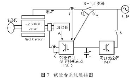 上海南洋電機(jī)廠采用ACS800-67 變頻器構(gòu)建雙饋風(fēng)力發(fā)電機(jī)的實(shí)驗(yàn)平臺,風(fēng)力機(jī)采用直流電動機(jī)模擬,即雙饋發(fā)電機(jī)轉(zhuǎn)子靠直流電動機(jī)拖動。系統(tǒng)連接示意圖如圖7所示。技術(shù)數(shù)據(jù)如下:發(fā)電機(jī)定子額定電壓690 V,定子額定電流1500A,額定頻率50 Hz,額定功率1 345kW,額定轉(zhuǎn)速1 513 r/min,同步轉(zhuǎn)速1 500 r/min,功率因數(shù)0.9,轉(zhuǎn)子開路電壓1990V,轉(zhuǎn)子電流550A;變頻器型號ACS800-67-0480/0770-7,調(diào)速范圍±30%。