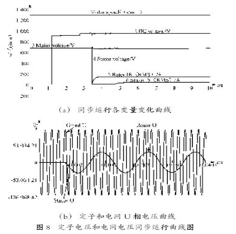 圖8(b)所示為電網(wǎng)U 相電壓與定子U 相電壓在同步過程中的變化曲線。由圖可知,當(dāng)變頻器投入運(yùn)行后,定子U 相電壓迅速建立,并與電網(wǎng)U 相電壓在相位、幅值上完全一致,達(dá)到同步的要求。