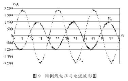 圖9 為發(fā)電機(jī)處于超同步運(yùn)行(轉(zhuǎn)子轉(zhuǎn)速為1 513 r/min),給定轉(zhuǎn)矩為額定轉(zhuǎn)矩的85%,無功功率給定為零時(shí),電網(wǎng)線電壓、相電流的波形圖。理論分析可知,當(dāng)發(fā)電機(jī)處于超同步運(yùn)行狀態(tài),發(fā)電機(jī)的定子側(cè)和轉(zhuǎn)子側(cè)應(yīng)同時(shí)向電網(wǎng)輸出電能,網(wǎng)側(cè)相電流為定子與轉(zhuǎn)子的電流之和。通常網(wǎng)側(cè)變流器的無功功率給定設(shè)置為零,所以定子與轉(zhuǎn)子電流的相位相同,都與電網(wǎng)電壓反相。實(shí)際上,由圖可知,電網(wǎng)相電壓與定子電流相位相差180°,完全反相,發(fā)電機(jī)處于發(fā)電狀態(tài),向電網(wǎng)輸出電能,功率因數(shù)為-1。