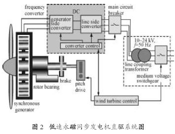 目前流行的變速變槳風(fēng)力發(fā)電機(jī)組的動力驅(qū)動系統(tǒng)主要兩種方案:一種是升速齒輪箱+繞線式異步電動機(jī)+雙饋電力電子變換器;另一種是無齒輪箱的直接驅(qū)動低速永磁發(fā)電機(jī)+全功率變頻器。兩種方案各有優(yōu)缺點(diǎn):前者采用高速電機(jī),體積小重量輕,雙饋?zhàn)兞髌鞯娜萘績H與電機(jī)的轉(zhuǎn)差容量相關(guān),效率高、價(jià)格低廉,缺點(diǎn)是升速齒輪箱價(jià)格貴,噪音大、易疲勞損壞;后者無齒輪箱,可靠性高,但采用低速永磁電機(jī),體積大,造價(jià)高,變頻器需要全功率,成本提高。