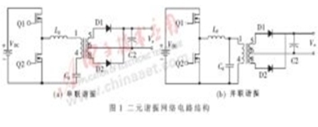 用兩個元件組成的諧振拓樸結(jié)構(gòu)主要有兩種:并聯(lián)結(jié)構(gòu)和串聯(lián)結(jié)構(gòu),分別如圖1(a)和圖1(b)所示。串聯(lián)諧振在輕負載時具有較高的效率,而在滿負載時轉(zhuǎn)換效率比較低;并聯(lián)諧振則反之,在滿負載時具有較高的轉(zhuǎn)換效率,而在輕負載時轉(zhuǎn)換效率比較低。而且串聯(lián)諧振和并聯(lián)諧振都要求較寬的頻率范圍。因此,這種二元的諧振網(wǎng)絡(luò)在實際應(yīng)用中都有一定的限制。