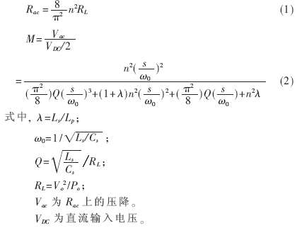串聯(lián)電感Ls、并聯(lián)電感Lp和諧振電容Cs組成LLC諧振網(wǎng)絡(luò),在此必須注意到負載也參與了諧振。對其進行建模,LLC簡化模型如圖2(b)所示,Ra c為副邊的負載折算到原邊的等效負載,折算公式見式(1)。因為原邊輸入電壓為方波,電流為近似正弦波,而變壓器輸出電壓也是方波,電流也是正弦波,因此可以推導(dǎo)出其電壓傳遞函數(shù),如式(2)所示。