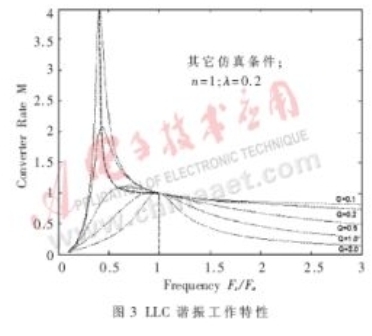 從圖3中可以看到,在整個頻率范圍內(nèi),既有降壓的工作區(qū)域(M<1),也有升壓的工作區(qū)域(M>1),因此LLC諧振有著較為廣闊的應(yīng)用范圍。在輕負載時,工作頻率逐漸升高,工作在降壓區(qū)域內(nèi);而在重負載時,工作頻率逐漸降低,工作在升壓區(qū)域內(nèi)。眾所周知,串聯(lián)諧振的工作區(qū)域是Fs/Fo>1,才能工作在ZVS的狀態(tài)下。從圖3中可以看到,在不同負載(即Q不同)下,為獲得ZVS的工作條件,只要使之工作在虛線的右側(cè)即可。而LLC諧振不僅僅局限于Fs/Fo>1區(qū)域,在某些負載下可以工作在Fs/Fo<1區(qū)域,同樣可以獲得零電壓轉(zhuǎn)換的工作狀況。并且與串聯(lián)諧振相比,在不同負載時的頻率變化范圍更小。因此,LLC諧振網(wǎng)絡(luò)有著其自身獨特的優(yōu)點。