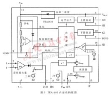TEA1610是Philips公司推出的零電壓全諧振半橋控制器,是采用高壓DMOS工藝的芯片,高側(cè)開關(guān)管的驅(qū)動耐壓最大可達600V,最大的振蕩頻率達1MHz。其內(nèi)部結(jié)構(gòu)如圖5所示。