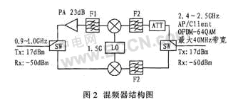 高性能的本振信號(hào)是影響混頻器輸出頻譜純度的主要因素。利用鎖相環(huán)頻率合成技術(shù)設(shè)計(jì)的本振源能為混頻電路提供性能良好的本振載波。在WLAN中,混頻器需將來自AP的2.4 GHz的信號(hào)下變換到950 MHz,以使信號(hào)能在特定的電纜上傳輸?;祛l器結(jié)構(gòu)圖如圖2所示。ADF4360-4產(chǎn)生1.5 GHz的本地振蕩器(LO),混頻器采用AD8343,F(xiàn)1為900 MHz~1000 MHz的帶通濾波器。F2為24 GHz~2.5 GHz的帶通濾波器。PA的信號(hào)功率較大,超過AD8343門限,必須衰減,ATT為衰減網(wǎng)絡(luò)。