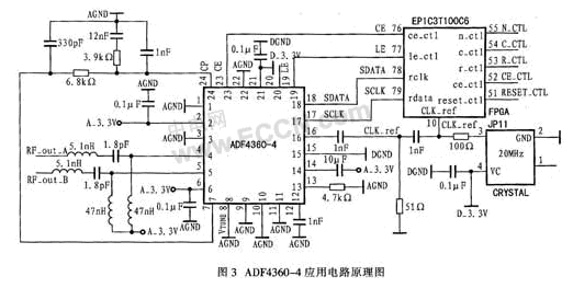 圖3是利用ADF460-4作為混頻器本振的外圍電路。外部晶體振蕩器為20 MHz,具有高穩(wěn)定性。該晶體振蕩器不僅為ADF4360-4提供參考頻率,還為控制ADF4360-4的FPGA器件提供時(shí)鐘。晶體振蕩器接ADF4360-4的參考時(shí)鐘輸入引腳CLK_ref,在內(nèi)部電荷泵輸出引腳CP和VCO輸出引腳VTUNE之間接入環(huán)路濾波電路。