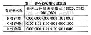 主分頻比N=1.5 GHz/200 kHz=7 500 。需要注意的是:雙模前置分頻器(P/P+1)輸出頻率要求小于300 MHz。因此選擇P/P+1=16/17,根據(jù)N=BF+A(A、B為整數(shù)),得到A=12,B=468。3個(gè)24位鎖存器的初始化設(shè)置如表1所示。
