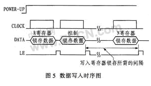 數(shù)據(jù)寫入時(shí)序:DATA在每個(gè)CLOCK的上升沿從MSB(最高有效位)開始依次寫入24位移位寄存器中的數(shù)據(jù)并一次鎖存到目標(biāo)寄存器,再開始下一個(gè)目標(biāo)寄存器的初始化。目標(biāo)寄存器選取由移位寄存器中的DB1、DB0決定。對(duì)寄存器賦值順序?yàn)镽,C、N。C寄存器和N寄存器賦值間隔應(yīng)大于5 ms,數(shù)據(jù)寫入時(shí)序如圖5所示。