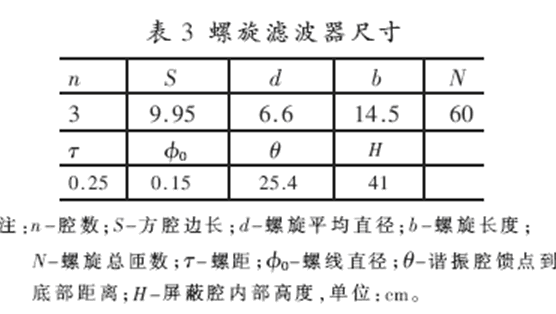 調(diào)頻范圍1.5M~3MHz;通帶中心插耗A0≤3dB;25dB帶寬△f25dB≥25kHz; 終端負載RS=RL=50Ω;傳輸功率P=100W。采用等元型螺旋濾波器設計法[6]確定的方腔螺旋腔濾波器腔數(shù)及尺寸見表3,測試結果見圖9、10及表4。