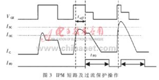,大多數(shù)IPM采用兩級(jí)關(guān)斷模式,過(guò)流保護(hù)和短路保護(hù)操作可參見(jiàn)圖3。其中,VG為內(nèi)部門極驅(qū)動(dòng)電壓,ISC為短路電流值,IOC為過(guò)流電流值,IC為集電極電流,IFO為故障輸出電流。