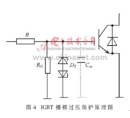 IGBT的驅(qū)動(dòng)設(shè)計(jì)問(wèn)題亦即MOSFET的驅(qū)動(dòng)設(shè)計(jì)問(wèn)題;設(shè)計(jì)時(shí)應(yīng)注意以下幾點(diǎn):①IGBT柵極耐壓一般在±20V左右,因此驅(qū)動(dòng)電路輸出端要給柵極加電壓保護(hù),通常的做法是在柵極并聯(lián)穩(wěn)壓二極管或者電阻。前者的缺陷是將增加等效輸入電容Cin,從而影響開關(guān)速度,后者的缺陷是將減小輸入阻抗,增大驅(qū)動(dòng)電流,使用時(shí)應(yīng)根據(jù)需要取舍。圖4為IGBT柵極保護(hù)原理圖,其中,RG、DZ、Cin分別為等效柵極阻抗、穩(wěn)壓管和等效輸入電容。②盡管IGBT所需驅(qū)動(dòng)功率很小,但由于MOSFET存在輸入電容Cin,開關(guān)過(guò)程中需要對(duì)電容充放電,因此驅(qū)動(dòng)電路的輸出電流應(yīng)足夠大,這一點(diǎn)設(shè)計(jì)者往往忽略。假定開通驅(qū)動(dòng)時(shí),在上升時(shí)間tr內(nèi)線性地對(duì)MOSFET輸入電容Cin充電,則驅(qū)動(dòng)電流為