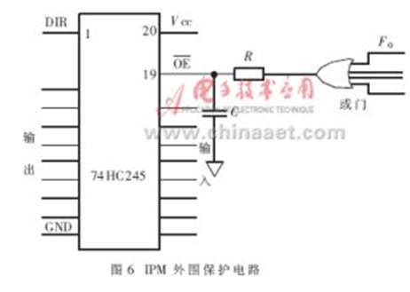 方案一 PWM接口電路前置74HC245、74HC244等帶控制端的三態(tài)收發(fā)器,如圖6所示。IPM的控制信號(hào)經(jīng)過(guò)74HC245的輸入、74HC245的輸出后送至IPM接口電路;各個(gè)IPM的故障輸出信號(hào)經(jīng)光耦隔離輸出后得到高電平FO,送入或門,或門輸出經(jīng)過(guò)R-C低通濾波器后,送入74HC245的使能端/OE。IPM正常工作時(shí),或門輸出為低電平,74HC245選通;IPM故障報(bào)警時(shí),或門輸出為高電平,74HC245所有輸出置為高阻,封鎖各個(gè)IPM的控制信號(hào),關(guān)斷IPM;實(shí)現(xiàn)了保護(hù)功能。
