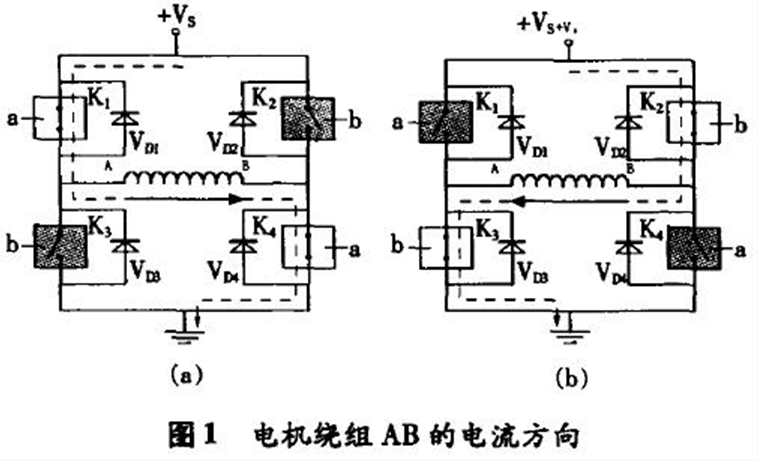4個開關(guān)K1和K4,K2和K3分別受控制信號a,b的控制,當控制信號使開關(guān)K1,K4合上,K2,K3斷開時,電流在線圈中的流向如圖1(a),當控制信號使開關(guān)K2,K3合上,K1,K4斷開時,電流在線圈中的流向如圖1(b)所示。4個二極管VD1,VD2,VD3,VD4為續(xù)流二極管,它們所起的作用是:以圖1(a)為例,當K1,K4開關(guān)受控制由閉合轉(zhuǎn)向斷開時,由于此時線圈繞組AB上的電流不能突變,仍需按原電流方向流動(即A→B),此時由VD3,VD2來提供回路。因此,電流在K1,K4關(guān)斷的瞬間由地→VD3→線圈繞組AB→VD2→電源+Vs形成續(xù)流回路。同理,在圖1(b)中,當開關(guān)K2,K3關(guān)斷的瞬間,由二極管VD4,VD1提供線圈繞組的續(xù)流,電流回路為地→VD4→線圈繞組BA→VD1→電源+Vs。步進電機驅(qū)動器中,實現(xiàn)上述開關(guān)功能的