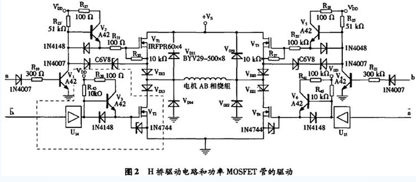 在圖2中,功率MOSFET管VT1,VT2,VT3,VT4和續(xù)流二極管 VD11,VD19,VD14,VD22相當于圖1中的K1,K2,K3,K4和VD1,VD2,VD3,VD4。功率MOSFET管的控制信號是由TTL邏輯電平a,a,b,b來提供的,其中a與a,b與b在邏輯上互反。