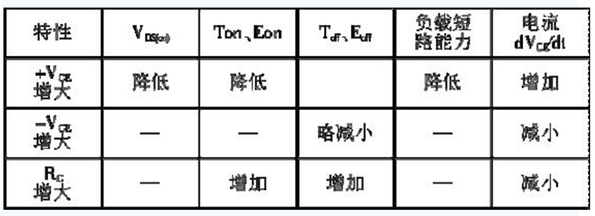 IGBT 的驅(qū)動(dòng)條件與它的靜態(tài)和動(dòng)態(tài)特性密切相關(guān)。柵極的正偏壓+VGE、負(fù)偏壓-VGE 和柵極電阻RG 的大小,對(duì)IGBT 的通態(tài)電壓、開(kāi)關(guān)時(shí)間、開(kāi)關(guān)損耗、承受短路能力以及dVCE/dt等參數(shù)都有不同程度的影響。門極驅(qū)動(dòng)條件與器件特性的關(guān)系如表1 所示。