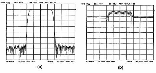 圖 3 SAW 濾波器的的直通信號抑制好(a)和差(b)對頻響的影響