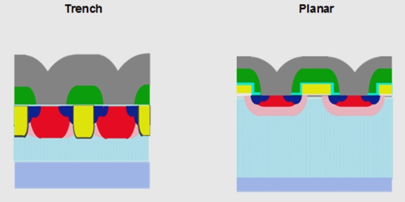 溝道型MOSFET的采用已成為當(dāng)前大部分車載應(yīng)用的標(biāo)準(zhǔn)。傳統(tǒng)的平面型MOSFET建立在硅晶圓表面之上,而溝道型MOSFET是在硅片上蝕刻垂直溝道,從而讓功率開關(guān)得以擁有更高的單元密度和更低的導(dǎo)通阻抗。由于這些電子機(jī)械系統(tǒng)大多數(shù)都采用了MOSFET H橋式電機(jī)驅(qū)動結(jié)構(gòu),兩個器件總是串聯(lián)以便使用更低電壓的MOSFET,同時(shí)仍然可以耐受常見的汽車高電壓沖擊現(xiàn)象。相比60V MOSFET,這些擊穿電壓更低的器件能夠把開關(guān)的導(dǎo)通阻抗降低50%,這意味著系統(tǒng)功耗減少50%,亦即系統(tǒng)發(fā)熱減少,最終把散熱要求降至最低。