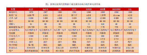 [page]20世紀(jì)70年代以來,電力電子學(xué)和微電子技術(shù)的出現(xiàn)和進(jìn)步,又重新喚起人們對(duì)交流傳動(dòng)系統(tǒng)的熱情。自1971年世界首臺(tái)采用異步交流傳動(dòng)系統(tǒng)的內(nèi)燃機(jī)車DE2500問世以來,交流傳動(dòng)系統(tǒng)以其突出的優(yōu)越性受到了各國(guó)鐵路運(yùn)輸部門的關(guān)注,獲得了長(zhǎng)足的發(fā)展,并已基本取代了直流傳動(dòng)系統(tǒng)。與直流傳動(dòng)機(jī)車相比,交流傳動(dòng)具有無可比擬的優(yōu)越性,這已經(jīng)在各國(guó)鐵路運(yùn)輸系統(tǒng)中得到了廣泛的驗(yàn)證。交流傳動(dòng)所用的三相交流異步電動(dòng)機(jī)比直流電動(dòng)機(jī)的功率/體積比和功率/重量比更大,無需經(jīng)常維護(hù),故障率低。異步電動(dòng)機(jī)的恒功率區(qū)比直流電動(dòng)機(jī)大許多,轉(zhuǎn)速更高,起動(dòng)牽引力大,持續(xù)功率大,有利于實(shí)現(xiàn)重載和高速牽引。交流傳動(dòng)可以很容易地實(shí)現(xiàn)電氣制動(dòng),大大減少制動(dòng)閘瓦的消耗,并可以利用制動(dòng)時(shí)反饋的能量,起到節(jié)能節(jié)油的作用,經(jīng)濟(jì)效益顯著。另外,交流傳動(dòng)機(jī)車的一個(gè)突出的優(yōu)點(diǎn)在于其優(yōu)良的粘著特性,由于異步交流電動(dòng)機(jī)變頻調(diào)速系統(tǒng)具有很硬的機(jī)械特性,車輪更不容易打滑或者空轉(zhuǎn)。其次,交流傳動(dòng)電力機(jī)車牽引和再生工況的功率因數(shù)均接近于1,不僅降低了電網(wǎng)損耗而且在再生制動(dòng)時(shí)可將高質(zhì)量電能反饋給電網(wǎng),消除了電網(wǎng)對(duì)信號(hào)和通信系統(tǒng)的干擾。再者,機(jī)車采用交流牽引電動(dòng)機(jī)后,簧下重量大大減輕,改善了輪軌動(dòng)力學(xué)性能,降低了機(jī)車輪緣磨耗。隨著磁場(chǎng)定向矢量控制和直接轉(zhuǎn)矩控制等高性能異步電動(dòng)機(jī)控制策略的應(yīng)用,交流傳動(dòng)機(jī)車的調(diào)速性能已經(jīng)能夠達(dá)到甚至超過直流傳動(dòng)機(jī)車。表1是國(guó)外比較有代表性的使用交流傳動(dòng)的電力機(jī)車和電動(dòng)車組。