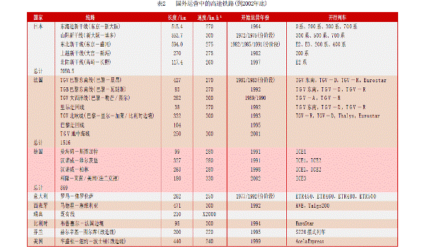 現(xiàn)在,越來越多的國(guó)家已經(jīng)擁有了或者正在或者準(zhǔn)備建設(shè)高速鐵路。截至2003 年底,世界上時(shí)速超過250km的高速鐵路運(yùn)營(yíng)里程已達(dá)到5 900km,還有近3 000km高速鐵路在建。計(jì)劃到2015年,世界上擁有高速鐵路的國(guó)家和地區(qū)將達(dá)到23個(gè),總里程會(huì)達(dá)到30 000km,歐洲地區(qū)將形成高速鐵路網(wǎng)聯(lián)通。表2所列的是到2002年底國(guó)外正在運(yùn)營(yíng)的高速鐵路概括。