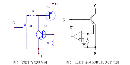 IGBT 有一定抗過電流能力,但必須注意防止過電流損壞。IGBT 復(fù)合器件內(nèi)有一個寄生晶閘管,所以有擎住效應(yīng)。圖5 為一個IGBT 的等效電路,在規(guī)定的漏極電流范圍內(nèi),NPN 的正偏壓不足以使NPN 晶體管導(dǎo)通,當(dāng)漏極電流大到一定程度時,這個正偏壓足以使NPN 晶體管開通,進而使NPN 和PNP 晶體管處于飽和狀態(tài),于是寄生晶閘管開通,門極失去了控制作用,便發(fā)生了擎住效應(yīng)。IGBT 發(fā)生擎住效應(yīng)后,漏極電流過大造成了過高的功耗,最后導(dǎo)致器件的損壞。