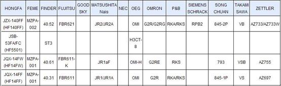 以繼電器為例,廈門宏發(fā)的繼電器產(chǎn)品能對(duì)富士通、歐姆龍、松下電工、松川等國際公司的產(chǎn)品進(jìn)行替代。具體可見下圖,如廈門宏發(fā)的JZX-140FF系列產(chǎn)品可以替代富士通FBR621、OMRON的G2R/G2RG、P&B的RKX/RKS系列產(chǎn)品等。