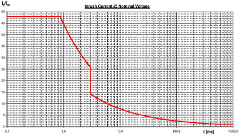 歐洲電信標(biāo)準(zhǔn)協(xié)會(huì)(the European Telecommunications Standards Institute)對(duì)用于通信系統(tǒng)的開關(guān)電源的沖擊電流大小做了規(guī)定,圖3為通信系統(tǒng)用AC/DC電源供電時(shí)的最大沖擊電流限值[4],圖4為通信系統(tǒng)在DC/DC電源供電,標(biāo)稱輸入電壓和最大輸出負(fù)載時(shí)的最大沖擊電流限值[5]。圖中It為沖擊電流的瞬態(tài)值,Im為穩(wěn)態(tài)工作電流。